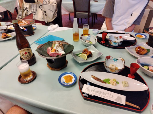 上田から菅平に上がりサニアパークに行くと中大vs延世大がやっていて芝生に寝転び観戦。涼しくて生き返る。でも雨が降って来たので、早々に引き上げ「角間温泉岩屋館」へ。秘境の秘湯で温泉入って、間もなく夕食です。